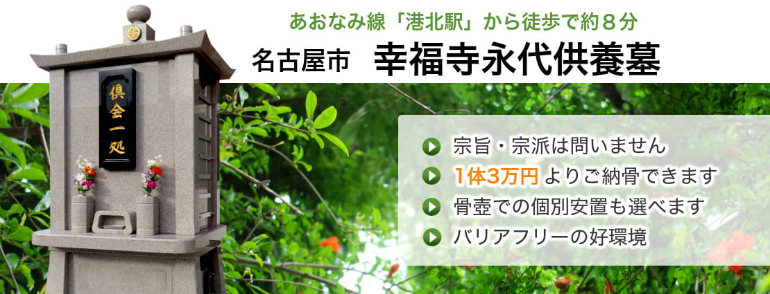 愛知県名古屋市にあります幸福寺(こうふくじ)永代供養墓は、宗旨宗派不問で、そしてご納骨費用のご負担も少なく、将来にわたって安心いただける永代供養墓です。2025年11月に完成いたしました。いつでも気持ちよくお参りいただける環境が整った、名古屋臨海高速鉄道「あおなみ線」港北駅から徒歩約8分の好立地です。